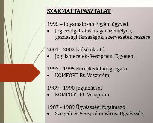 Mindig arra törekszem, hogy felkészülten, lelkiismeretesen és emberközpontúan lássam el Ügyfeleim képviseletét.